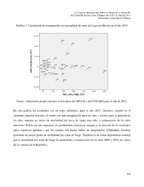 Gráfica 3. Correlación de marginación con mortalidad de arma de fuego en México en el año 2015